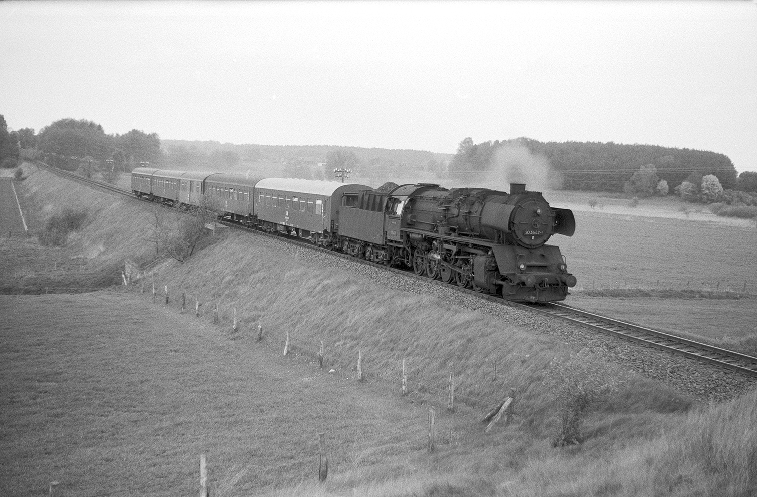 Foto: Detlef Radke, 50 3642 mit Personenzug Schwerin-Parchim vom 11. Mai 1986 vor dem Bahnhof Friedrichsruhe