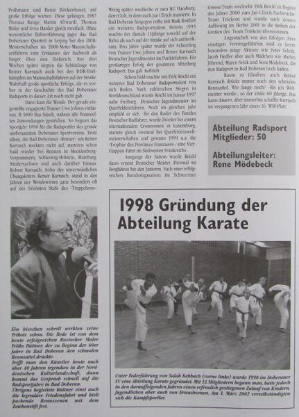 - Dann kam die Wende. Der gerade eingestellte diplomierte Trainer Uwe Johren entlassen. Der B1000 Bus futsch. Nahezu alle finanziellen Zuwendungen gestrichen. So begann das Sportjahr 1990 für die Radsportler des gerade in „ Doberaner Sportverein“ umbenannten Clubs. Trotz allem, die Bad Doberaner Radsportler um Reiner Karrasch steckten nicht auf, starteten schon bald wieder bei Rennen in Mecklenburg Vorpommern, Schleswig Holstein, Hamburg, Niedersachsen und darüber hinaus. Robert Karrasch, der Sohn des unverwüstlichen Übungsleiter und auch erfolgreichen Rennfahrers Reiner Karrasch, stand ganz besonders oft auf der höchsten Stufe des „Treppchens“. Wenig später wechselte er zum RC Hamburg, dem Verein, in dem auch der spätere Tour de France Siegers Jan Ullrich trainierte.