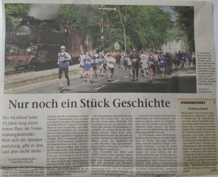 - Wenig später profilierte sich neben Wettkämpfen auf dem Sportplatz „Am Stülower Weg“ oder im Kellerswald (Cross Läufe) mit dem „ Mollilauf“ auch eine hochkarätige Laufveranstaltung. Unter Federführung von Hotelier Dr. Horst Metz, der gerade privatisierten Bäderbahn „Molli“, dem Kreissportbund und dem Doberaner Sportverein profilierte sich der Volkslauf über drei, sechs und 12 Kilometer schnell. Für Aufsehen sorgte stets der sechs-Kilometer Start, der in Heiligendamm unter dem lauten Pfeifen des „Mollis“ erfolgte. Dann kämpfte auf der Strecke Heiligendamm-Bad Doberan erneut Mensch gegen Maschine, wie einst auf dem Kamp zwischen Mensch und Draisine. Irgendwann kam dieser Traditionslauf ins straucheln. Beherzt sprang dann das Bad Doberaner Rote Kreuz in die Bresche und setzt diese schöne Tradition erfolgreich fort.