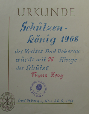 - Franz(Jg. 1926), war als Eisenbahner auf dem Bahnhof Bad Doberan tätig und hatte sich dem Schießsport verschrieben.