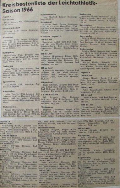 - Auch eine überaus engagierte Frau muss unbedingt genannt werden, wenn es um die Bad Doberaner Leichtathletik Geschichte geht: Sigrid Bauch. Sie hielt in den 50er Jahren zumindest kurzzeitig mit 2:30,1 Minuten den DDR Rekord im 800 Meter Lauf. Später stießen u.a. Dieter Ulonska und Dieter Schmidt zu den Leichtathleten, die sich bereits 1952 in der gerade gegründeten BSG Lok Bad Doberan ansiedelten. Letzterer erkämpfte als B Jugendlicher den Bezirksmeistertitel im Speerwurf. Leider wurde diese Sektion wenig später aufgelöst. Schmidt ließ diese schöne Sportart jedoch nie los. 1962 nach seinem Studium baute er gemeinsam mit Erwin Schulze in der SG Dynamo Bad Doberan eine Leichtathletik Sektion und später auch ein Trainingszentrum auf. Auch hier ließen Erfolge nicht lange auf sich warten. So wurde z. B. Eckhard Höfer DDR Jugendmeister im Crosslauf, Rita Jahnel und der spätere Bad Doberaner Landrat Thomas Leuchert, um nur einige zu nennen, nahmen erfolgreich an Kinder- und Jugendspartakiaden im DDR Maßstab teil. Zahlreich waren seiner Zeit auch die Delegierungen zum Leistungszentrum SC Dynamo Berlin.