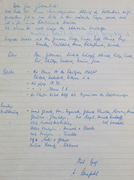 - An Mitstreiterinnen wie Lisa Götze(Ender), Irmtraut Götze, Ulla Ostrowski, Dagmar Hancke, Hille Kreuzfeld, Christa Gabrahn, Almut Köller u. a. kann ich mich erinnern. Betreut und vorbereitet wurden wir von Helga Hoffmann, Otto Wolski, O. Jenderney, Otto Pentzin und J. Westendorf.