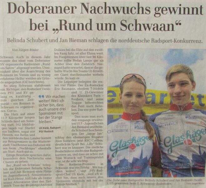 - In Bad Doberan wurde indes fleißig weiter trainiert. Mit Jacob Fiedler und Marlen Jörend formte Reiner Karrasch, der weiterhin den schmalen Rennsattel drückt, weitere talentierte Akteure, die bei diversen Proficlubs zahlreiche Erfolge einfuhren.