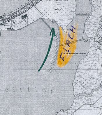 ... Inzwischen hat sich aber herausgestellt, daß die bei dem neuen Durchstich notwendigen Baggerarbeiten riesigen Umfang annehmen, die Kosten außerordentlich steigen und bei der Baggerung der Fahrrinne zum Breitling Geschiebemergel zu baggern wäre.