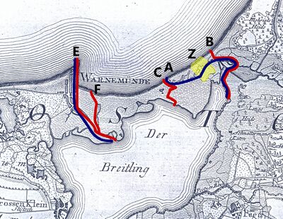 ; "...so an der Meeresküste entlang bis zum östlichen Ufer oder dem Wasser des Flusses von Warnemünde..." | ; "...so an der Meeresküste entlang bis zum östlichen Ufer oder dem Wasser des Flusses von Warnemünde..." | ||