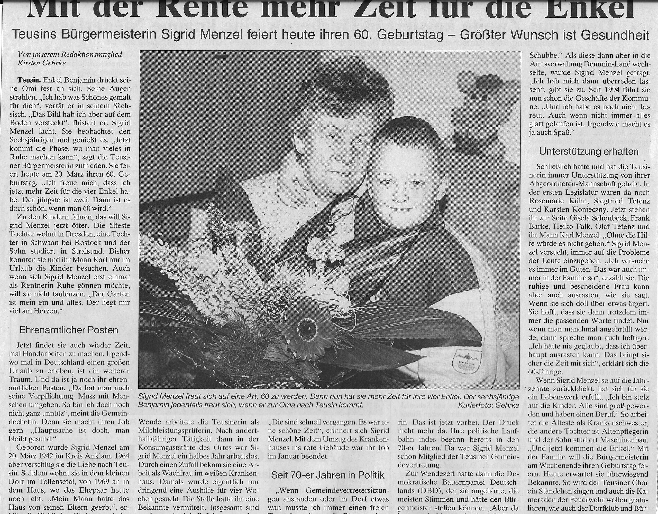 60. Geburtstag Bürgermeisterin Teusin, Demminer Zeitung vom 20.3.2002, Text/Foto: Kirsten Gehrke